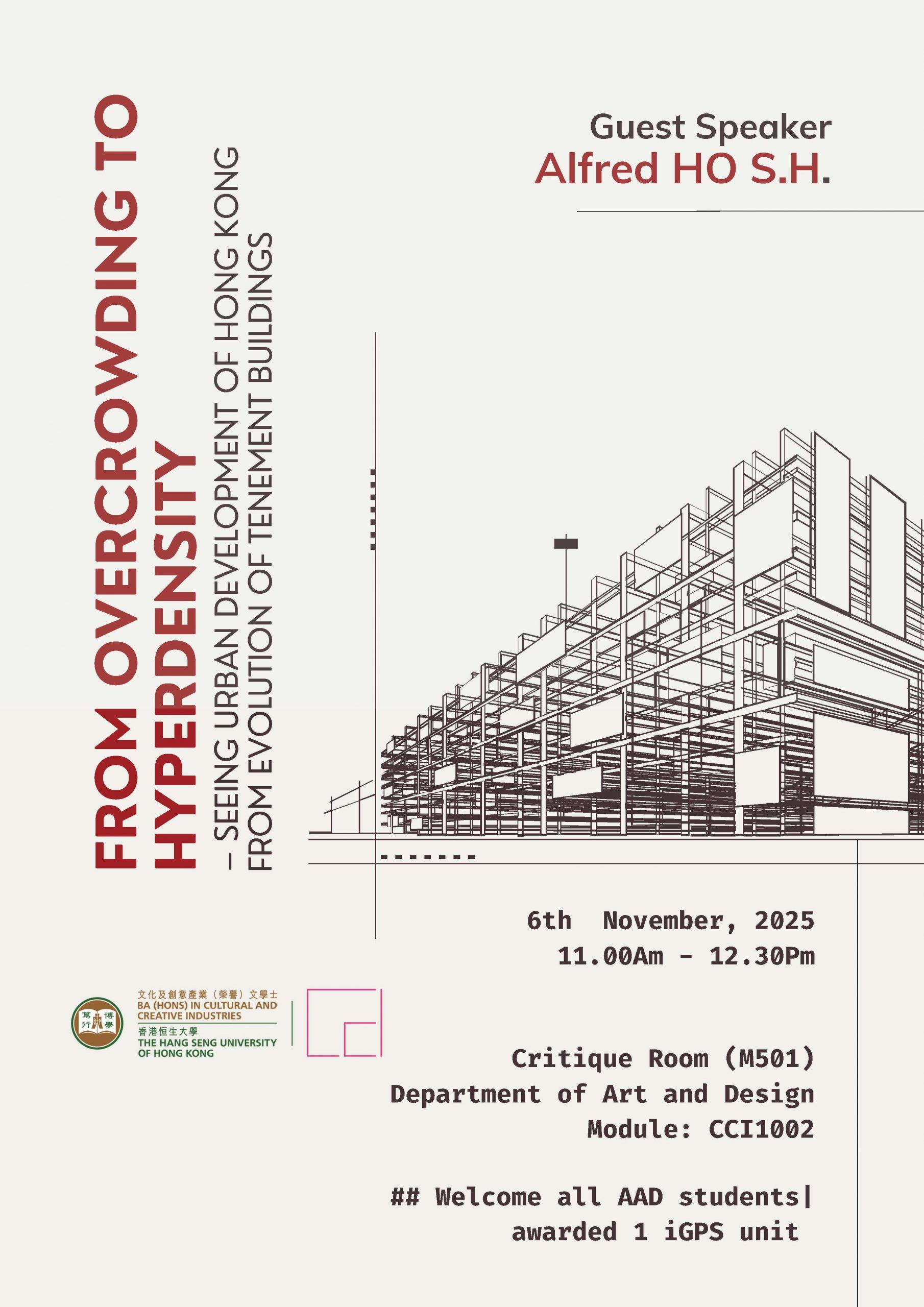 CCI1002 Guest Talk – FROM OVERCROWDING TO HYPERDENSITY – SEEING URBAN DEVELOPMENT OF HONG KONG FROM EVOLUTION OF TENEMENT BUILDINGS 6 NOV 2025 11:00AM – 12:30 PMM501